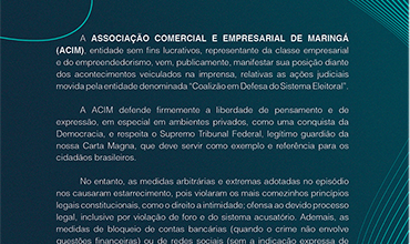 No documento, “a ACIM defende firmemente a liberdade de pensamento e de expressão, em especial em ambientes privados, como uma conquista da Democracia e respeita o Supremo Tribunal Federal, legítimo guardião da nossa Carga Magna, que deve servir como exemplo e referência para os cidadãos brasileiros”.